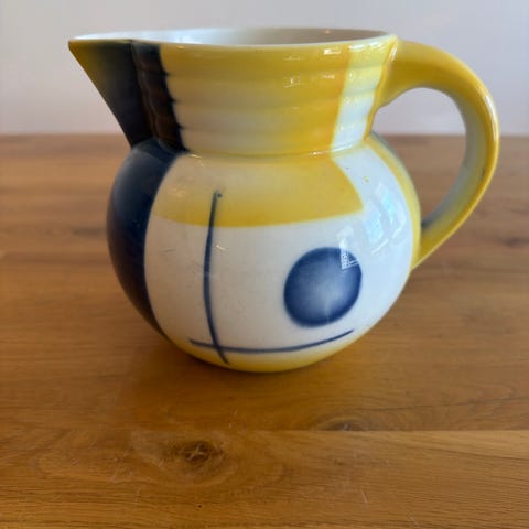 Retro keramikkmugge fra 60/70-tallet i flotte farger. Ingen skår eller skader, men krakkelering i overglasuren. Høyde 18 cm, diameter oppe 10 cm. Kan sendes med PostNord for kr 69,-.