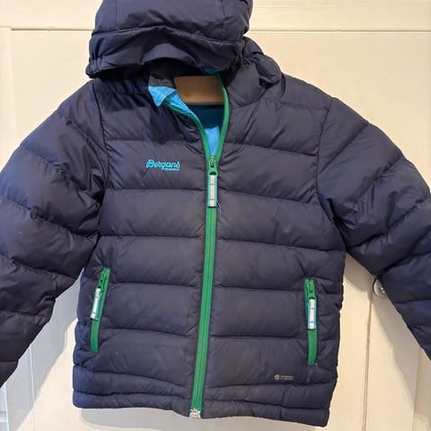 Tynn dunjakke str 116. Hel og pen, men er noen dun som stikker ut. Lommer med glidelås.