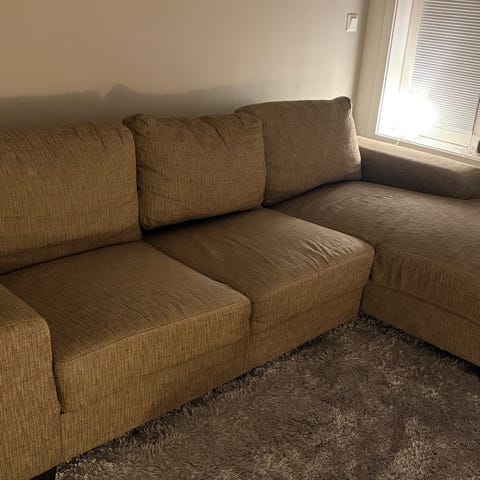 Vi gir bort sofaen vår da vi har kjøpt oss en ny sofa. Den er lys beige og veldig god å sitte i. Vi kjøpte den brukt for ca ett år siden.