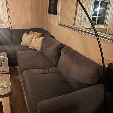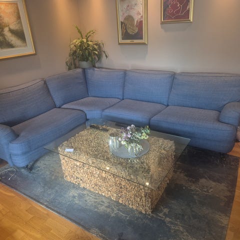 Godt brukt hjørnesofa med noe synlig slitasje gis bort så raskt som mulig. Den er ca 10 år gammel men putene har fortsatt god spenst.
