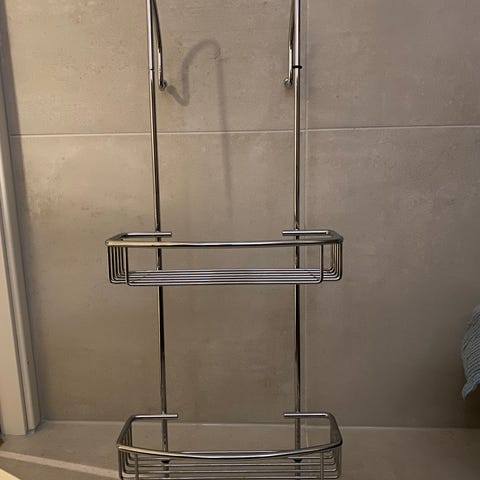 Dusjhylle med to kurver i sølvfarget metall. Hyllen henges over dusjvegg eller kant ved hjelp av integrerte kroker øverst. De to trådkurvene gir plass til oppbevaring av såpe, sjampo og andre baderomsartikler. Åpen trådkonstruksjon gjør at vann renner lett av og bidrar til at innholdet tørker raskere. Egnet for bruk på bad og i dusjområde der det er behov for ekstra oppbevaringsplass.