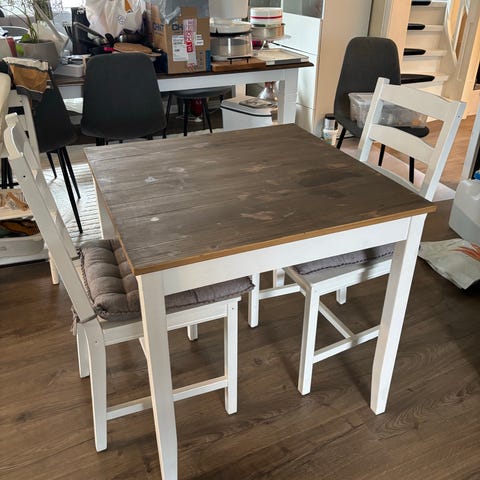 147/207x95x74. Klaff under bordplaten (147 uten, 207 med). Pent brukt og i god stand. Praktisk bord til hverdags, hatt det ca 10 år. Selges pga overgang til større bord. Noen mindre skjønnhetsfeil, se bilder. Obs, kun bordet selges.