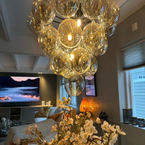 Gross taklampe fra By Rydéns er et eksklusivt tilskudd til hjemmet. Den består av 37 glasskuler i en gylden amber finish som skaper en herlig stemning i rommet. Lampen har et stilrent design med en diameter på 50 cm, og kan festes med en krok i taket. Lengden på opphenget er 120 cm, noe som gir mulighet for justering av høyden.