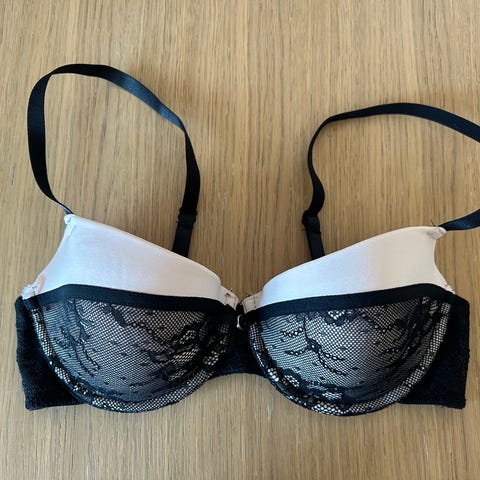 Hunkemöller BH for dame i størrelse 75E. BH-en er hvit og laget i polyester med blondedetaljer over cupene og langs kanten. Justerbare skulderstropper og lukking bak med hemper.