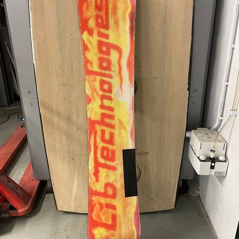 Elan snowboard med bindinger. Snowboardet har oransje såle med Elan-logo og overflate i blått og mørke toner med grafisk mønster. Boardet leveres med monterte snowboardbindinger i lys beige og grå farge med svarte baseplates. Ca 155cm langt.