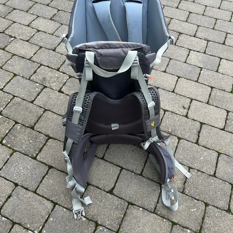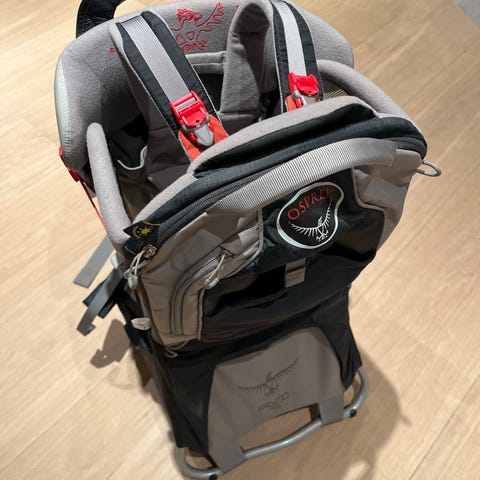 Osprey bæremeis. God oppbevaringsplass med liten lomme til småting, en lomme bak ryggen, og et stort rom nederst. Fin sol/regnskjerming som er lett å ta opp og pakke ned. Regntrekk inkludert.