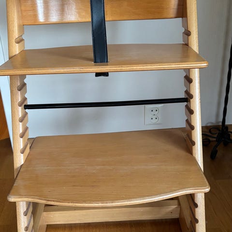 Stokke Tripp Trapp høy barnestol i tre med naturfarget finish. Stolen har justerbar sitteplate og fotbrett som kan tilpasses barnets høyde. Leveres med bøyle og rem foran for ekstra støtte til mindre barn. Egnet som spise- og sitteplass ved bord for barn i ulike aldre, avhengig av tilpasning av høyde på sete og fotbrett.