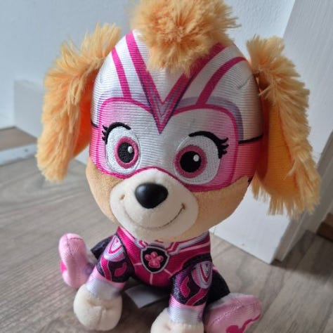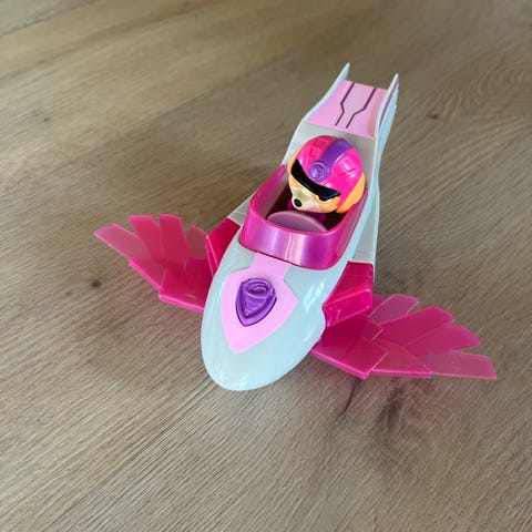 Paw Patrol Skye figur leke i plast. Figuren forestiller karakteren Skye i rosa uniform og hjelm. Leken er formet som en hund med detaljerte poter og ryggsekk. Egnet som rollelek-leke for barn som liker Paw Patrol-universet. Kan brukes alene eller sammen med andre Paw Patrol-figurer og kjøretøy (ikke inkludert). Har lyd og bevegelse ved å trykke på en knapp