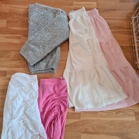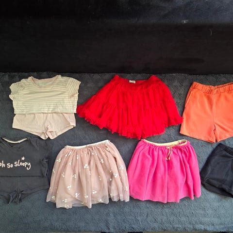 Jente- klær i størrelse 146, flerfarget. Sett med ulike plagg som blant annet shorts og overdeler, egnet til hverdagsbruk for jente i denne størrelsen. Klærne har forskjellige farger og mønstre som gir variasjon i garderoben. 2 t~skjorter, 1 topp, 1 shorts og 1 tørkle