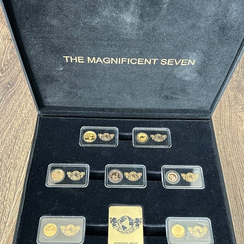 2023, Gibraltar, 7 proof gullmynter i skrin med eierbevis og sertifikater.