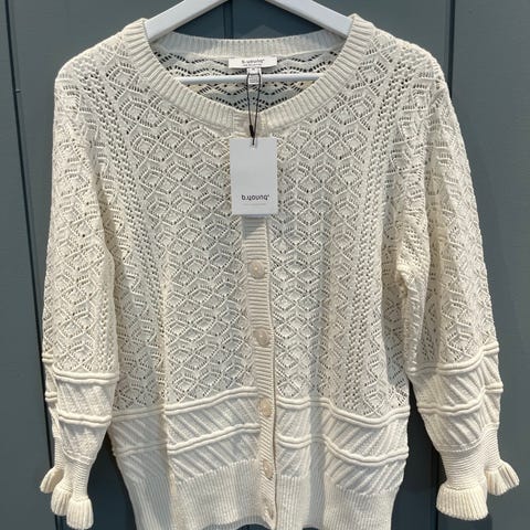 Bik Bok cardigan i ullblanding for dame i størrelse M. Cardiganen er hvit og har et strukturert strikkemønster med hull- og flettestrikk. Modellen har V-hals og knepping foran med knapper. Materialet inneholder ull, som gir et mykt og varmt plagg egnet til bruk over topper, kjoler eller skjorter.