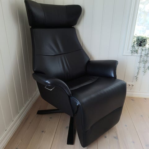 Nesten ubrukt komfortabel skinnstol reclainer. Høy rygg og god polstring. Stått i kjellerstue og er lite brukt. Lader følger med.