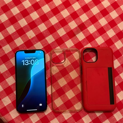 Det følger med et rosa Holdit-deksel og en ladekabel med USB‑C til Lightning-tilkobling.
