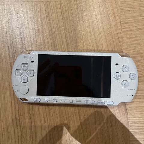 Sony PSP håndholdt spillkonsoll i svart. Konsollen bruker UMD-plater til spill og media. Fire spill i originalcover, samt original eske og brukerdokumentasjon til konsollen. PSP har innebygd skjerm, kontrollknapper, høyttaler og UMD-spiller for bærbar gaming. Egnet til å spille kompatible PSP-spill og se innhold lagret på UMD eller minnekort, som medfølger.