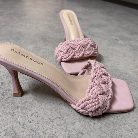 Steve Madden sandaler med 10 cm høye hæler i størrelse 39. De er lite brukt og i perfekt stand. Modellen har to brede, flettede remmer over foten og åpen tå. Skoene har høy, blokkformet hæl og glatt yttersåle. Fargen er nude / lys rosa.