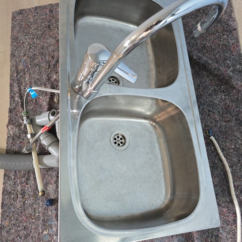 Kjøkkenvask rustfritt stål med to kummer og avrenningsfelt