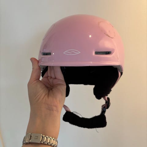 Anon barnehjelm i rosa/lilla med grafiske figurmønstre på sidene og bak. Hjelmen har myke øreputer, justerbar hakestropp og ventilasjonsåpninger. Egnet til ski og snowboard for barn.