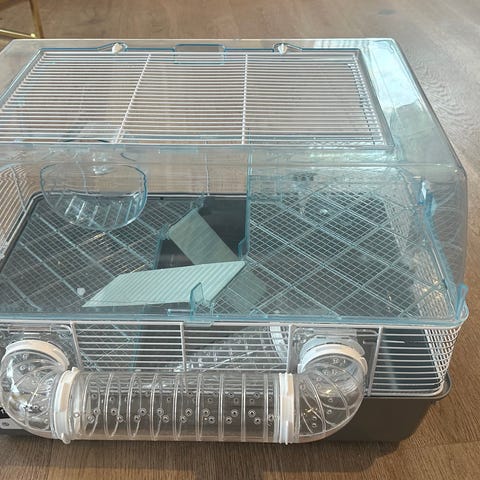 Selger dette super fine ferplast hamsterburet (nypris 1300) den er original blå som vist på bilde fra nettsted, men er spraymalt hvit for å passer bedre inn i rommet! (Med trygg maling) malen er borte noen små steder