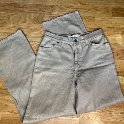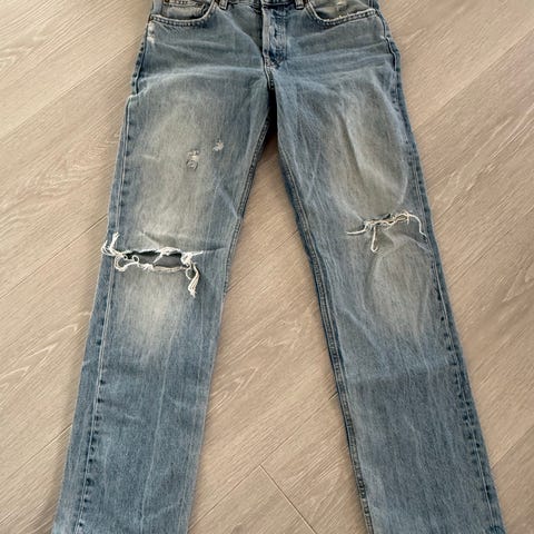 By Malene Birger jeans i blå denim for dame. Buksen har størrelse M og livvidde W29. Klassisk femlommersmodell med beltehemper, knapp og glidelåslukking. Stoffet er denim i bomullsblanding med slitte og hullete partier som en del av designet. Passer til hverdagsbruk og kan kombineres med ulike topper og sko for et avslappet uttrykk.