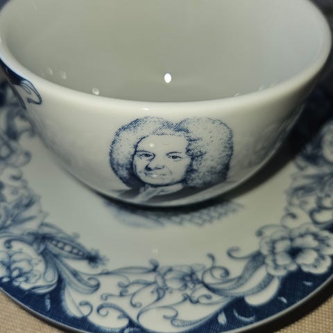 Twinings te-kopper fra Porsgrund. Blått/hvitt mønstret med portrett av Thomas Twining. Produsert i 1999.