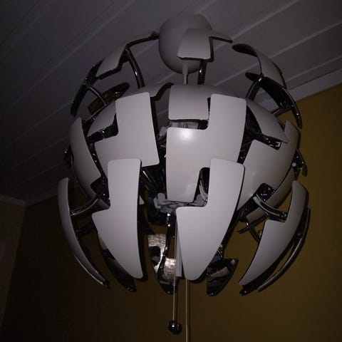 IKEA PS 2014 taklampe er inspirert av science fiction-filmer og ble en av vinnerne i den internasjonale designkonkurransen Red Dot Award. Endre formen og styrken på lyset ved å dra i snorene.
