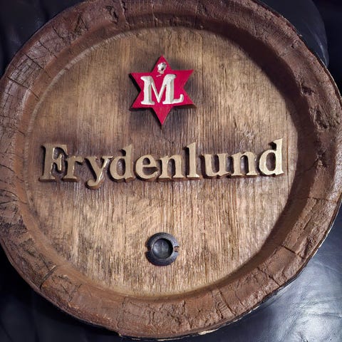 Frydenlund reklameskilt utformet som en øltønnebunn .