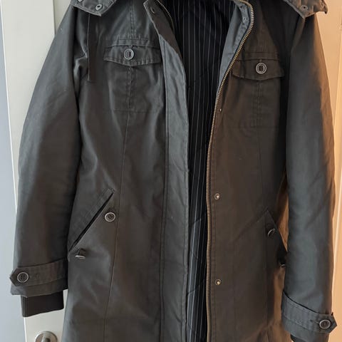 Fin og varm vinterjakke fra Cream som ser litt annerledes ut enn de fleste andre kjedelige vinterjakker, både på grunn av den fine rødfargen og fordi sømmene er sydd på skrått. Det står størrelse 38, men den føles mye større, så jeg har oppgitt at dette er Str L. Den har blitt litt liten til meg, så nå er den nyvasket og klar for ny eier. Den er ganske lang (120 cm fra skulder og ned), rekker meg til kneet og meg er 180. Den har avtagbar hette og knapper ved lommene. Kan sendes, hentes på Nesodden eller overleveres i Oslo.