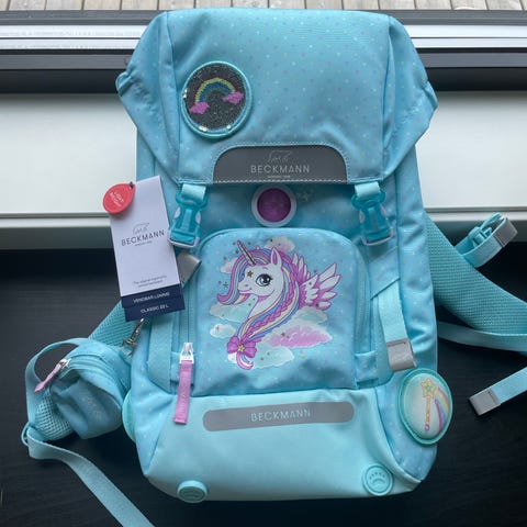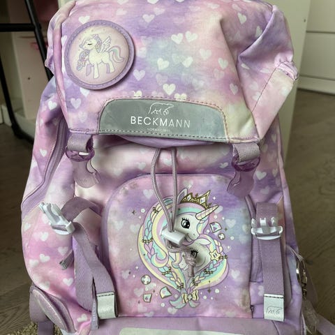 Beckmann skolesekk med enhjørningmotiv i flerfarget design med hovedfarge lilla. Sekken har polstrede skulderstropper og brystreim for bedre bærekomfort. Flere rom og lommer gir plass til bøker, matboks og andre skoleting. Ytterlomme foran og sidelommer for enkel tilgang til mindre gjenstander. Passer til barn i 1-5 klasse.