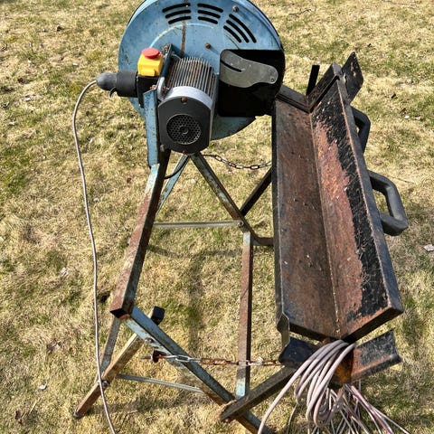 Kapp 40 vedkappsag for kapping av ved og trevirke. Elektrisk drevet sag montert på stativ, med beskyttelseskappe rundt sagbladet. Ha også kappsag av annet merke. Egnet til stasjonær bruk i verksted, garasje eller vedskjul for oppkapping av vedkubber og annet treverk innenfor maskinens kapasitet.