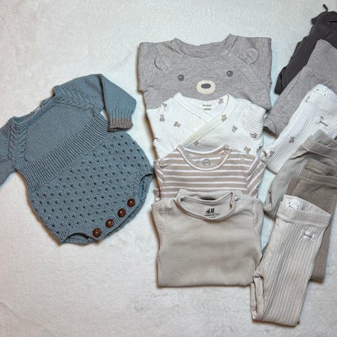- 5 overdeler (4 body og 1 genser) Bamsebody fra Newbie har noen gule flekker ved halsen som vises på bilde, ikke forsøkt flekkfjerning.
