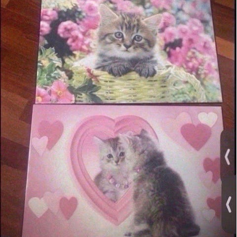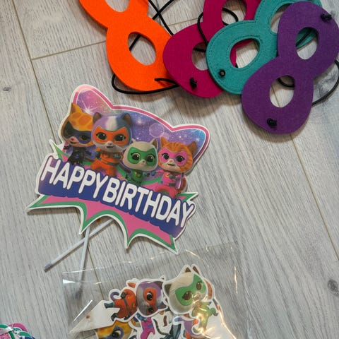 Kattebursdag dekorasjonspakke, flerfarget motiv med katter. Settet inneholder blant annet kattemasker i papp (4 stk), girlander med kattehoder til oppheng, 5 katte kakelys (brukt 1 gang, veldig kort), små kattetopper på pinner og servietter med kattemotiv (10 stk). Egnet som bord- og romdekorasjon til bursdag eller temafest med katt som tema. Kan hentes på Skjetten.