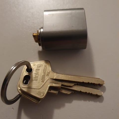 Låssylinder.Har vært montert I hybel og blitt byttet ut etter vedkommende har flyttet ut.2 nøkler medfølger