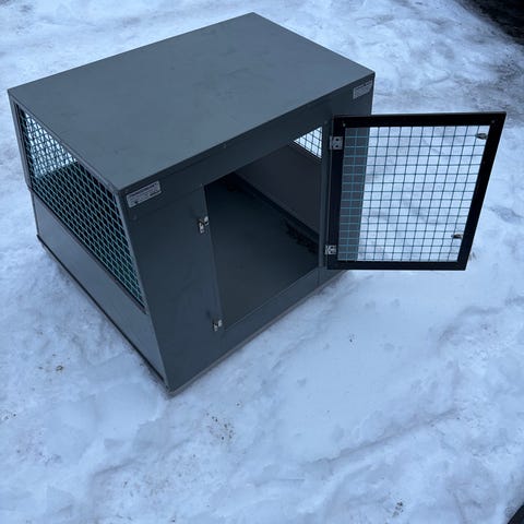 Buret har åpning i front. Passer til mellomstore hunder. Pent brukt.