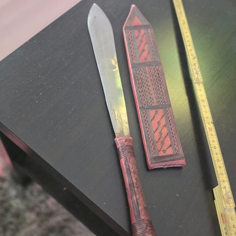 Gammel håndlaget lærslire til stor machete – dekorert med nagler og frynser