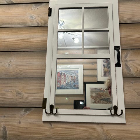 Gammelt koselig vindu til dekorasjon. Vinduet er 53 cm høyt og 46 cm bredt. Det er malt i en turkis farge på ene side den og er orginalt hvitt på den andre.