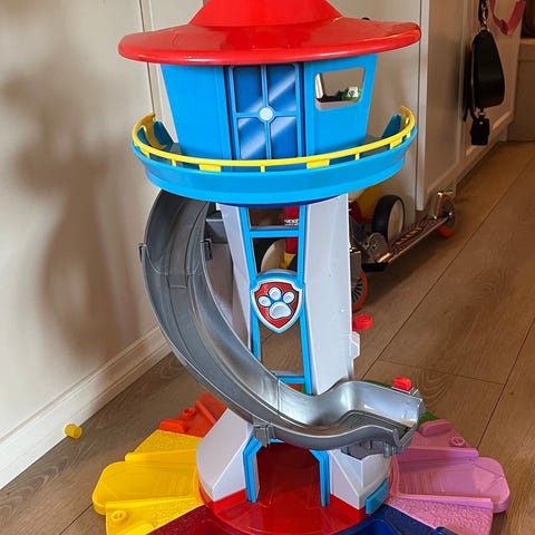 Paw Patrol lekesett utkikkstårn. Tårnformet lekesett med rampe og flere plattformer, inspirert av Paw Patrol-serien. Passer til lek med små kjøretøy og figurer fra Paw Patrol-universet. Laget i fargerik plast med røde, blå og grå detaljer.