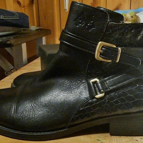 Jean Paul Camargue støvler i størrelse 38. Ankelhøye støvler i svart farge med glidelås på siden og hempe bak. Modellen har lett hæl og elastisk parti i skaftet for bedre passform. Egnet som hverdagsstøvler i overgangssesonger. Tilsalgs kr 600,-. Ny pris 1000,-.