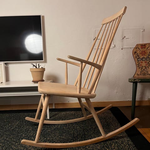 Carl Hansen gyngestol designet av Hans J. Wegner. Gyngestol i lyst treverk med høy rygg og spiler. Sete i flettet papirgarn. Armlener i tre og klassisk understell med meier som gir gyngende funksjon. Passer som sittemøbel i stue, lesekrok eller andre oppholdsrom der man ønsker en komfortabel stol med tidløst uttrykk.