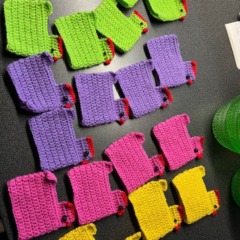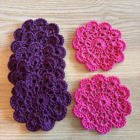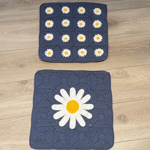 Bordskånere i grønn farge, formet som blomster. Settet inkluderer også to heklete grytekluter i flerfarget stripemønster. Egnet til bruk på kjøkkenet for å beskytte bord og benker mot varme kjeler og gryter, samt til håndtering av varme kjøkkenredskaper.