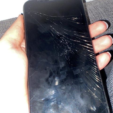 Samsung Galaxy A-serien mobiltelefon med 64 GB intern lagring. Modellen har berøringsskjerm og front som på bildene viser knust/sprukket glass. Baksiden har et deksel eller etui montert. Egnet for bruk med apper, surfing og lagring av