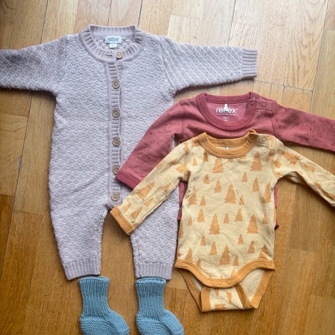 Selger sett til nyfødt fra reflex. Kan brukes fra nyfødt til 3 mnd. Nypris alt 1456. Minimale tegn ( litt nupper) til bruk på dress og tøfler.lue og votter som nye.