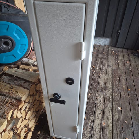 Selger et solid og FG-godkjent våpenskap med plass til 6 våpen. Skapet fremstår som svært lite brukt og i meget god stand.