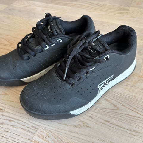 Northwave terrengsykkelsko i størrelse 40. Skoene er svarte med hvite og røde detaljer. De har borrelåsstropper kombinert med en justerbar spenne over vristen for sikker lukking. Sålen er utstyrt med klosser for klikkpedaler og har grovt mønster for godt grep ved gåing. Egnet for bruk med SPD-lignende klikkpedaler.