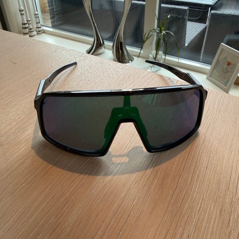 Oakley Sutro sort lilla, solbriller unisex med lilla glass. Modellen har helskjerm-design med stor, sammenhengende linse som gir bredt synsfelt og god dekning rundt øynene. Innfatningen er i plast med blank svart finish, og linsene har lilla/rødlig speilfarge. Passer til både kvinner og menn og kan brukes til hverdags og ulike utendørsaktiviteter der solbeskyttelse er ønsket. Det er noen små merker/striper på glasset, men ser det ikke fra 1 meter, og klarte ikke få tatt bilde av det….