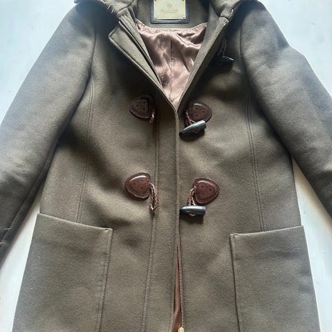 Massimo Dutti kåpe i ull for dame i størrelse 38, oppleves litt liten i str. Er selv str 38, og denne er brukt to ganger kun da den oppleves litt liten. Kåpen er grønn og har lukking med glidelås kombinert med dekorative hemper i front. Modellen har hette med pelskant og to frontlommer. Materialet er ullblanding som gir et strukturert og mykt uttrykk. Passer som yttertøy i kjøligere sesonger.