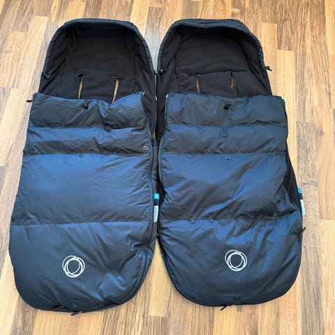 Bugaboo vognpose i to farger: én grå og én svart. Vognposene er polstret og har åpninger for seler, tilpasset bruk i barnevogn. Ytterstoffet er glatt og quiltet, og posene har hette/overdel som kan trekkes rundt barnets hode for ekstra beskyttelse. Passer i de fleste Bugaboo-barnevogner med standard selefester og kan brukes i kjøligere vær for å holde barnet varmt i vognen.