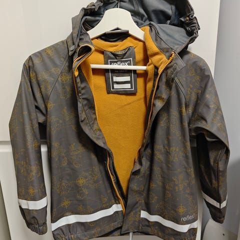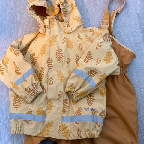 Reflex foret regnjakke og regnbukse for barn i størrelse 98. Jakken er gul med bladmønster og har refleksdetaljer på ermer og nederkant. Ytterstoff i polyester og mykt fôr på innsiden. Unisex-modell egnet til hverdagsbruk og utelek.