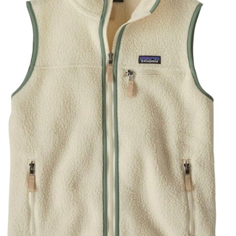 Patagonia fleecevest for dame i størrelse M. Vesten er laget i myk, tykk fleece i beige med kontrastfelt og detaljer i mørk blå. Den har høy krage, glidelås i front og glidelåslommer i sidene samt en brystlomme med glidelås. Egnet som mellomlag eller ytterlag ved mildere vær, til hverdagsbruk og ulike fritidsaktiviteter