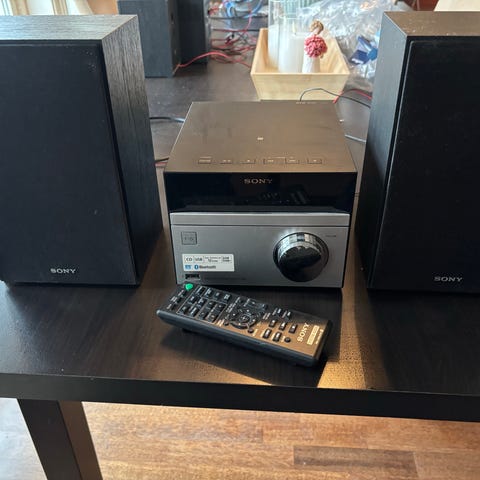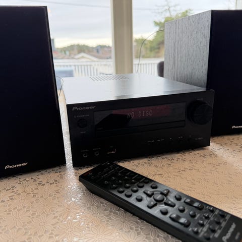 Godt brukt minianlegg. Onkyo CR‑535. Fjernstyrer virker ikke lenger. Går evt ann å få billig på Ebay, søk "Onkyo CR-535 remote".