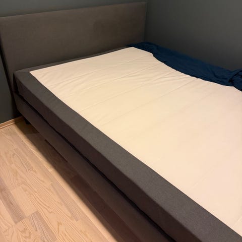 Dobbel seng og grå sengeteppe/overmadrass-trekk. Sengen står på svarte underdeler/sengebunner og er plassert mot vegg i et soverom. Passer som standard dobbeltseng til soverom, gjesterom eller tilsvarende bruk.